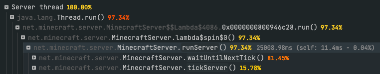 In the example above, we can see that waitForNextTick() accounts for 81% of the CPU activity on the "Server thread". This is healthy! It means that on average, the server was able to spend around 80% of the 50 milliseconds allocated for each tick doing absolutely nothing.